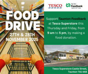 You can support Taunton Foodbank by joining us at Tesco Superstore on Castle Street this Thursday and Friday between 9am and 5pm and donating food. Thank You.